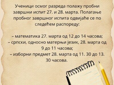 /26 mar 2026 Пробни завршни испит Ученици осмог разреда полажу пробни завршни испит 27. и 28. марта. Полагање пробног завршног испита одвијаће се по следећем распореду: – математика... Pročitaj više