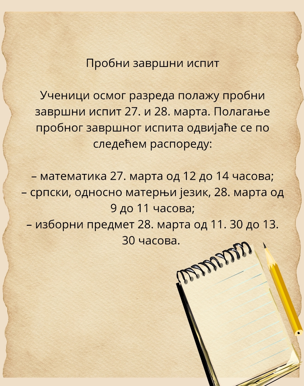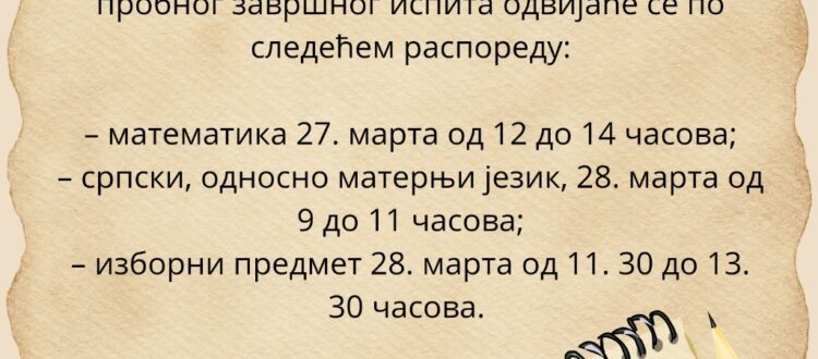 Ученици осмог разреда полажу пробни завршни испит 27. и 28. марта. Полагање пробног завршног испита одвијаће се по следећем распореду: