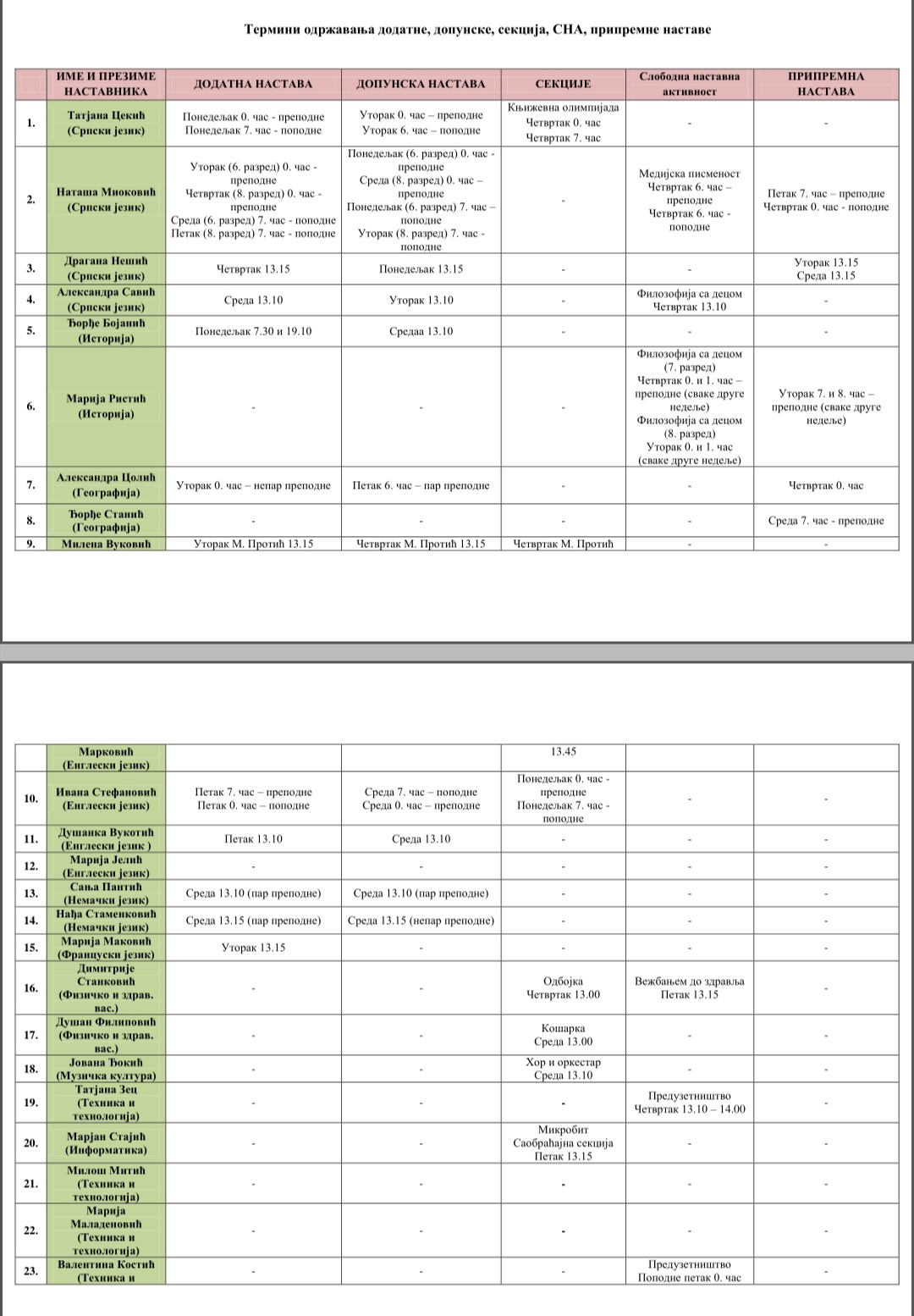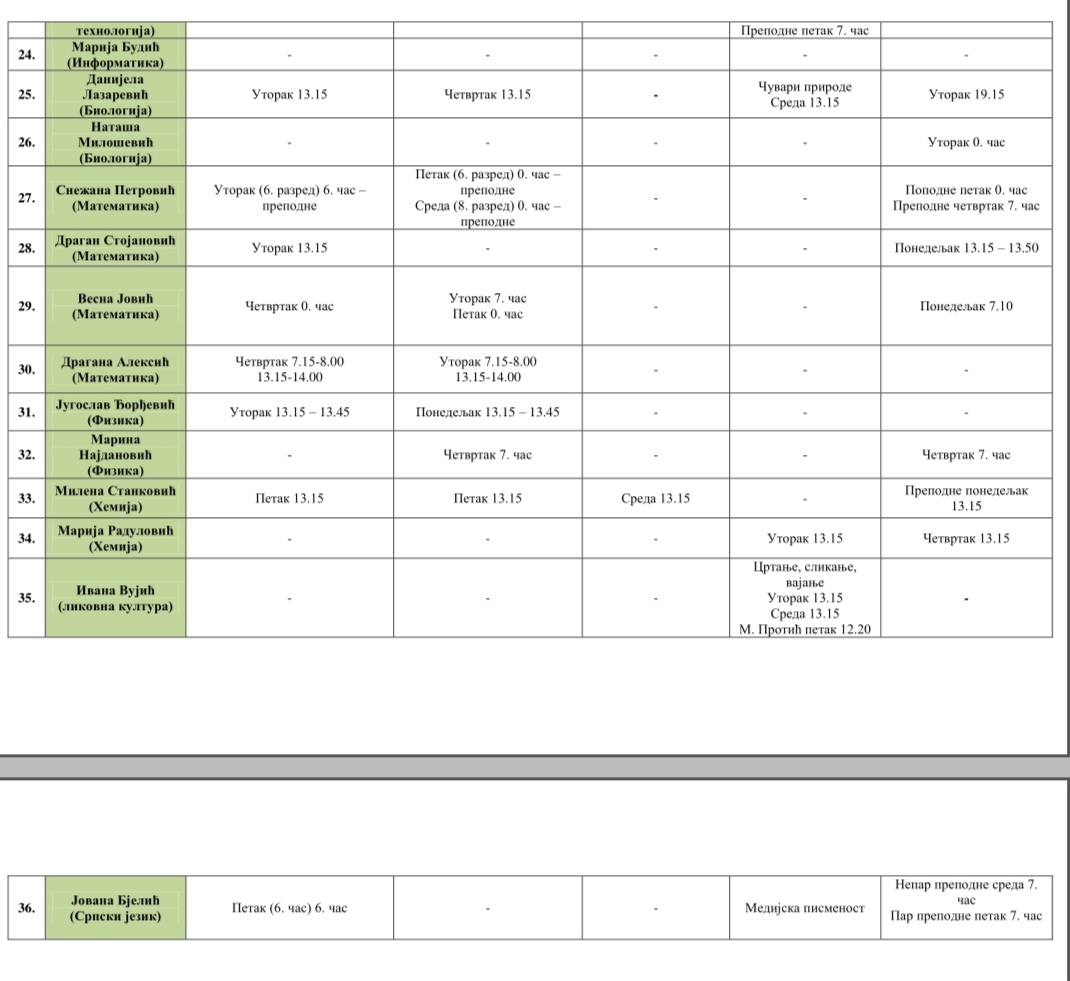 Распоред додатне, допунске наставе, секција, слободних наставних активности и припремне наставе